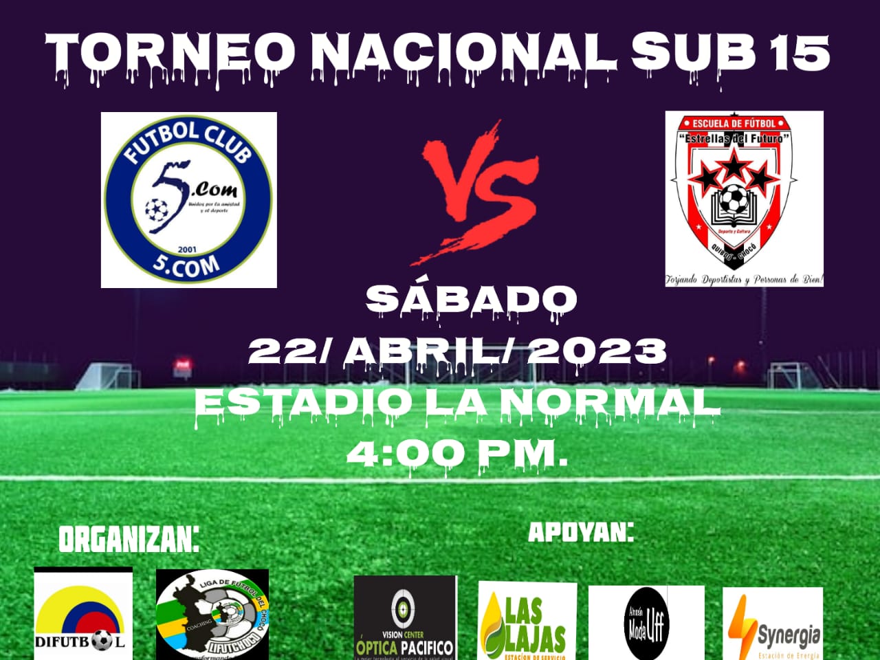 Mañana sábado 22 de abril, en el Estadio «Cancha la Normal» de la ciudad de Quibdó, se encontraran las escuadras Sub 15 en el marco del Torneo de Nacional de Futbol Sub 15, de la DIFUTBOL, 2023, invitamos a toda la afición del Futbol Quibdoseño a que vean de primera mano las promesas del futbol local.